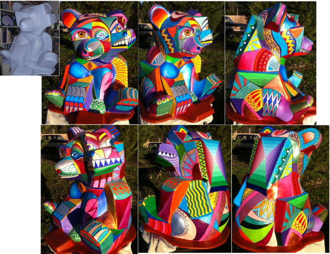 The City of Grants Pass, Oregon and Evergreen Federal Bank sponsored "Bearfest" for 3 years in a row beginning in 2003. I was one of the artistis invited to particiapte. We were provided pre-fab fiberglass bear shapes to embelish. My "Cubist Cub" was donated to the Grants Pass Art Museum and has adorned the outside entrance to the museum since then. In 2014, Evergreen Bank decided that the Cub needed to be re-inforced and re-fiberglassed, which meant it had to be completely re-painted. You can see below the before and after images.
