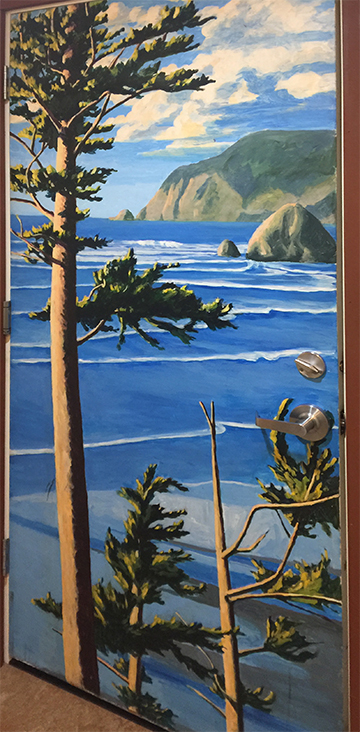 Another Evergreen Bank project were The Doors of Oregon. The bank took over an old riverside hotel and renovated it. The original solid wood doors were recycled by hiring aritists to each decorate two sides of a door depicting famous Oregon scenes. I chose Oregon Coast as my subject.